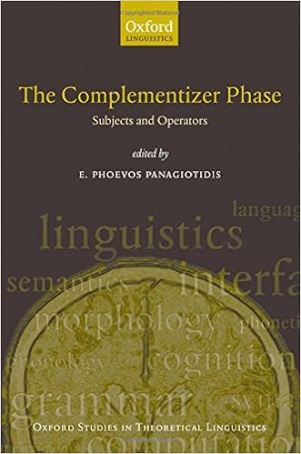 This e-book attracts jointly 9 unique investigations via top linguists and promising younger students at the syntax of complementisers (eg that in She acknowledged that she would) and their words. The chapters are divided into components, every one of which highlights points of the behaviour and serve as of complementisers. the 1st half appears to be like at how and while topics, or elements of matters, can and can't circulation open air their canonical place in a sentence. every one bankruptcy examines and compares the relevance of a few syntactic components in languages equivalent to English, Italian, Spanish, Greek, Brazilian Portuguese and Bavarian. within the moment half, the focal point turns to the character and serve as of complementisers themselves, with discussions drawing on facts from Italian, Italian dialects, Hebrew, and Dutch.